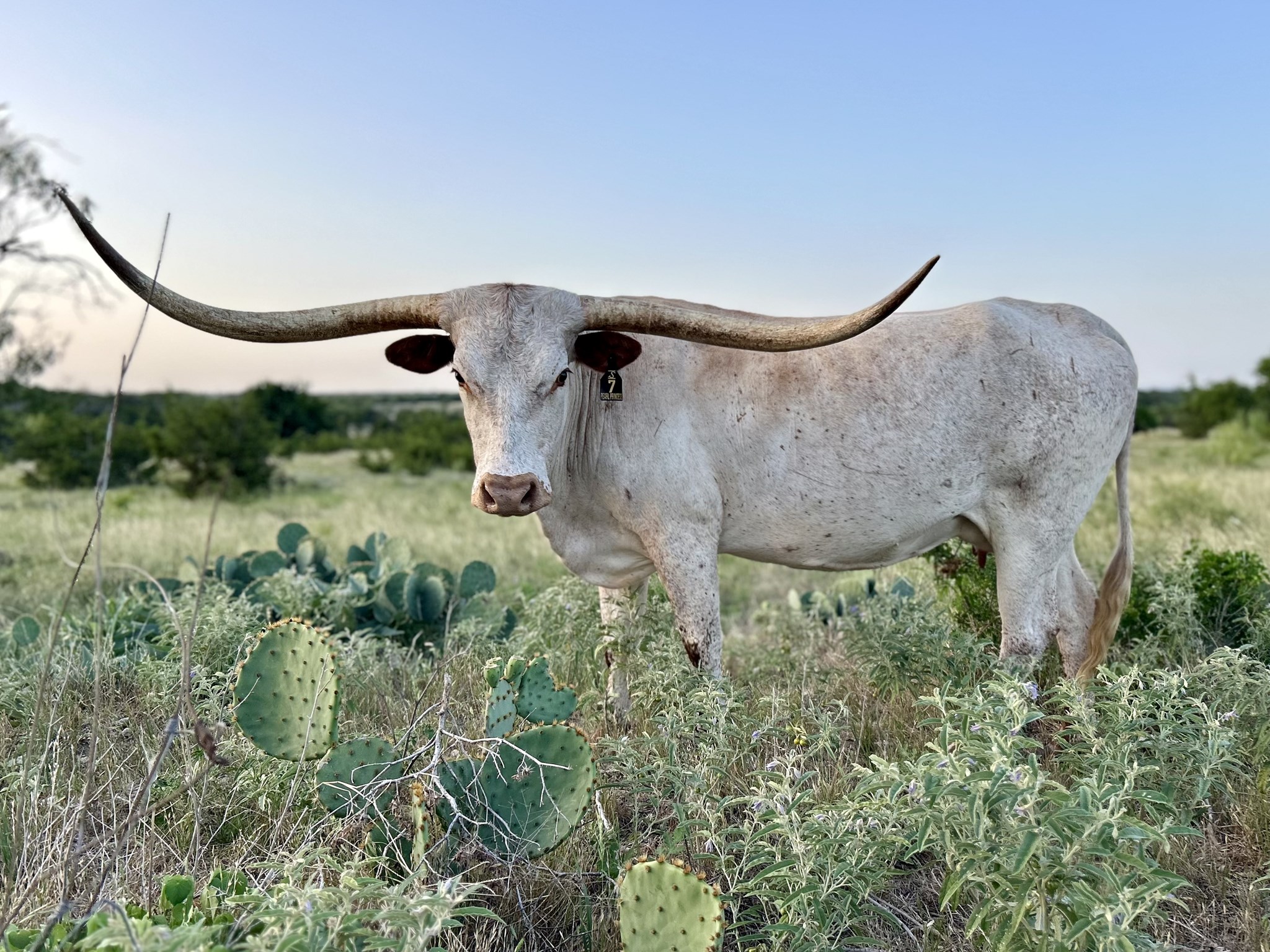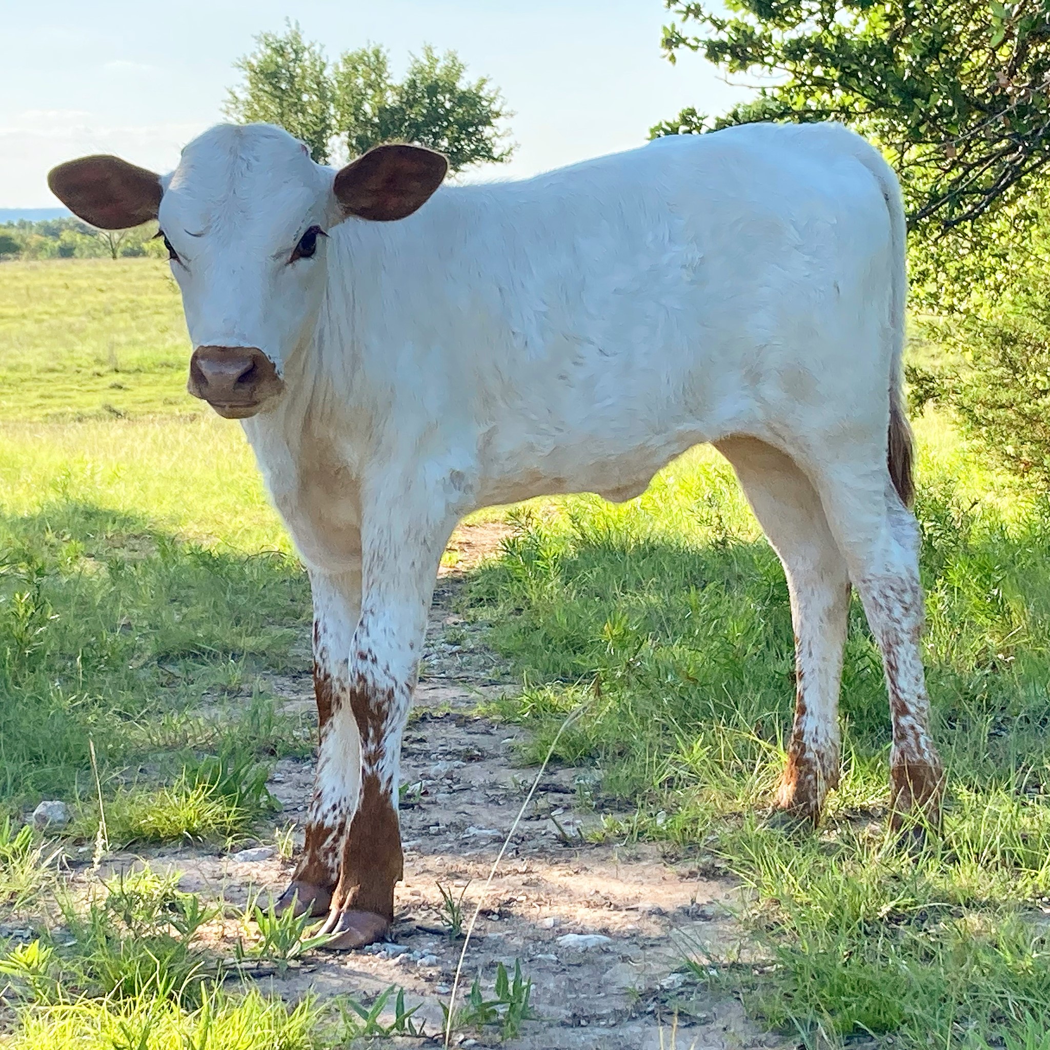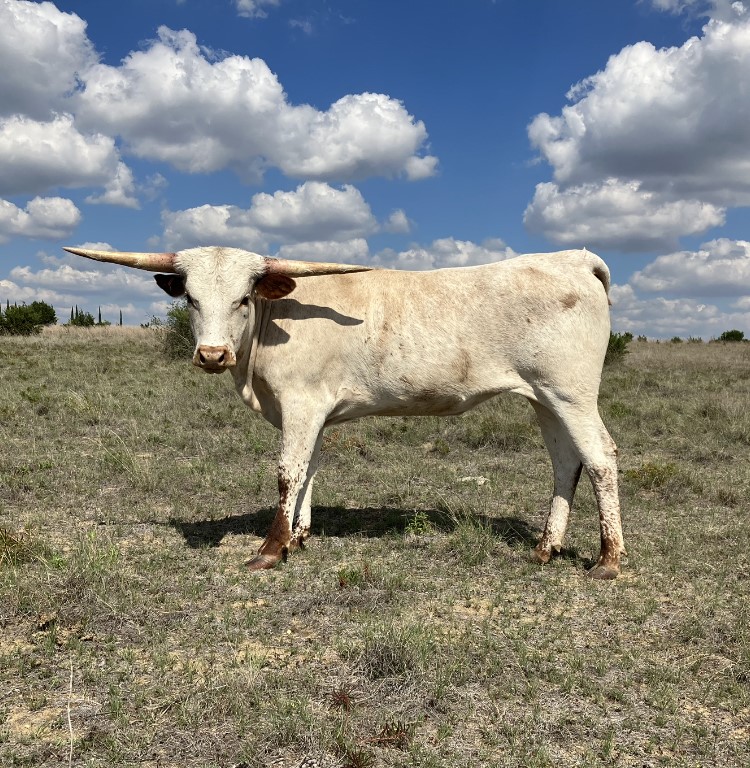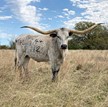 Absolutely gorgeous heifer calf from 89" nearly 2000lb Line Up. Her emerging color pattern mirrors her mother's and seems to be changing by the day. Her Dam HL Possum Princess measured 86" December of '25 of the most beautiful symmetrical twist we've ever seen. Pearl is a half brother to Double S Tiger King, who won bronze at Millennium Futurity this year and placed 7th (out of 265) bulls in the NFLR. She will be exposed to Journeyman at time of sale.