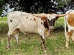 “Tanny Boy” demonstrates a correct conformation with a straight top line, deep, strong shoulder and well angled back end. His striking tri-color brindle face recalls grandsire Drag Iron and his black and gold spotted socks are reminiscent of his great grandsire Victory Lap. His horns were 53” TTT in April 2025 and have grown considerably since. He is showing a lateral corkscrew development twist like his dam, Tanny O, a beautiful line back and proven producer with several years in a commercial herd before joining the Rocking V Ranch.