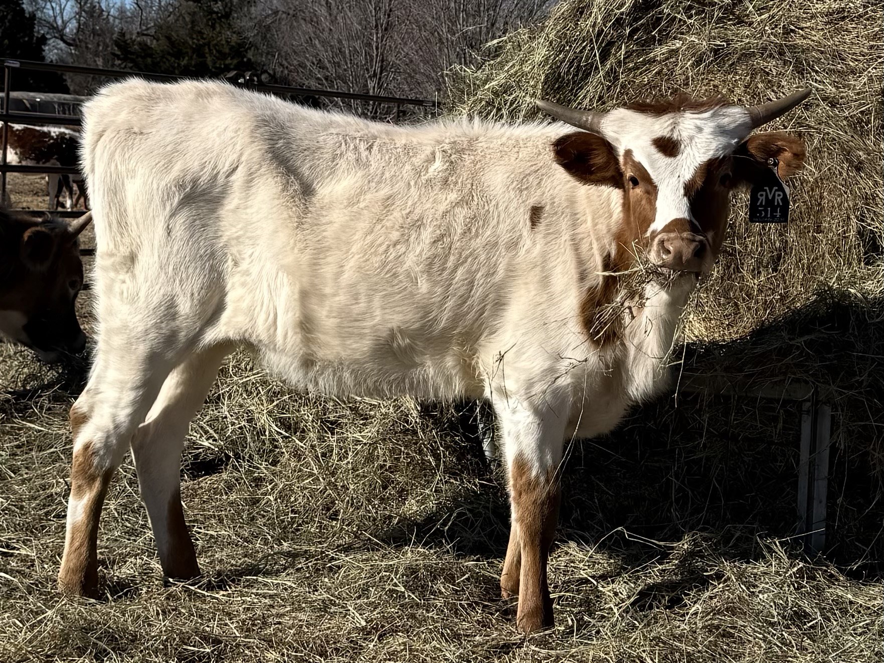 Cissy's sire is a flashy young bull whose lineage includes Drag Iron, Over Lap, Victory lap and Jamakizm, Shamrock Unbreakable, VJ Tommie and Private Edition. Cisca-M, her dam, is a striking cow with perfect conformation from horn to tail. She is a great producer, having spent a number of years in a commercial herd, calving like clockwork every year. Cissy is a friendly heifer that loves treats and pets. She brings together a sweet disposition with the kind of pedigree that works — combining horn potential, femininity, fertility, and balance.